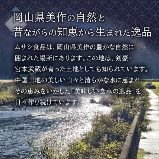中国山地の美しい山々と、豊かな水に恵まれた「晴れの国」岡山県美作のムサシ食品。卓越した自然が宮本武蔵を育てた歴史と響きあって誕生した美味しい食卓の逸品を作りました。
